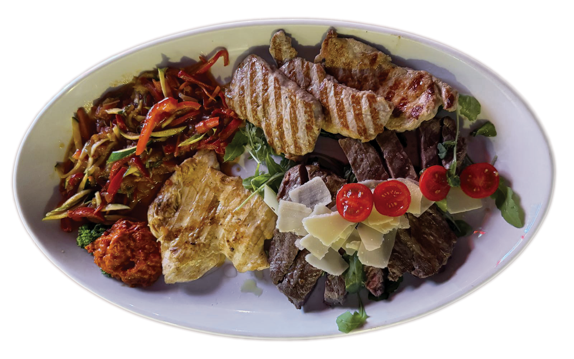 tagliata od ramsteka, teleći kotleti, piletina, povrće